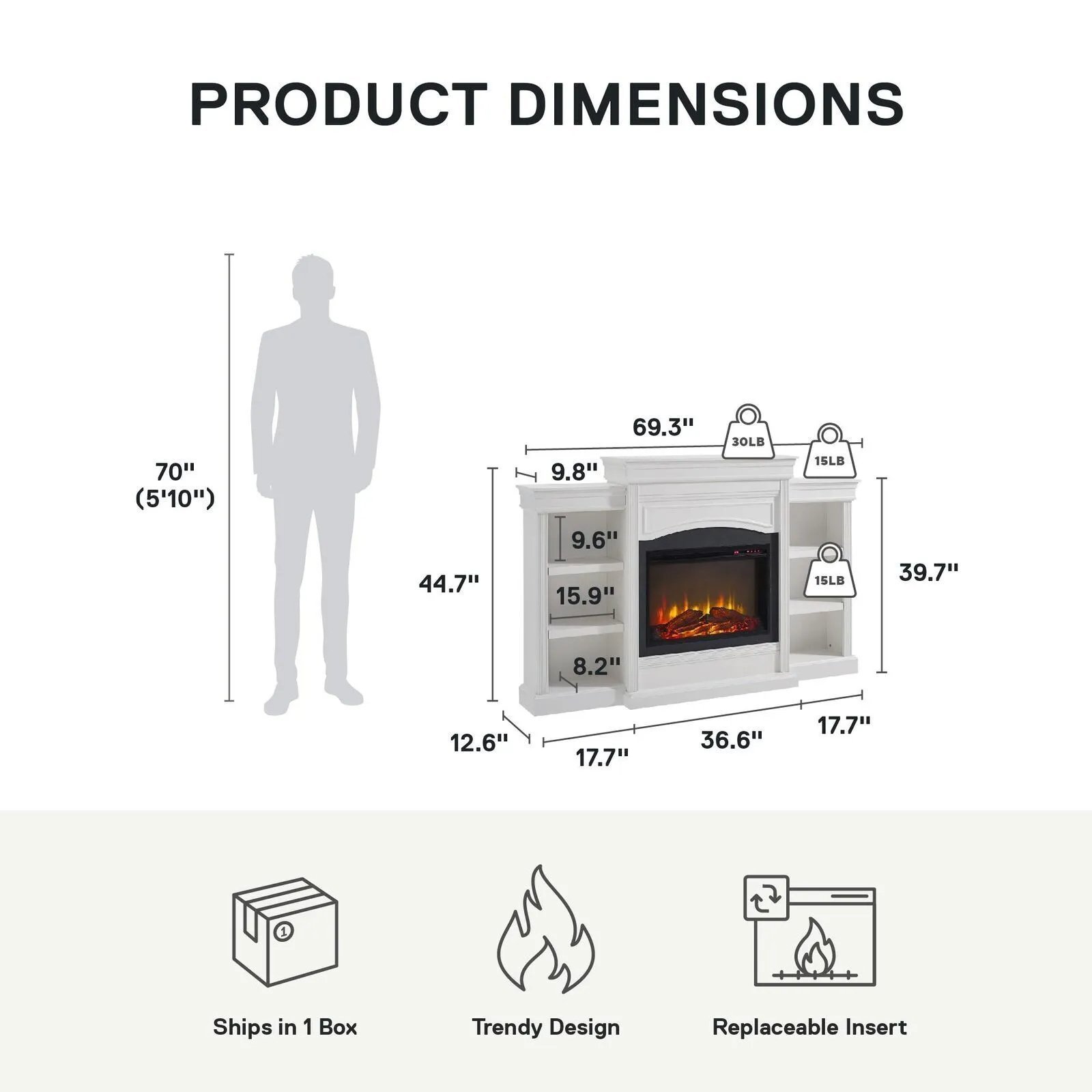 Love being in your living room again as you cozy up next to the Ameriwood Home Lamont Mantel Fireplace. The laminated MDF and particleboard is finished in a white finish for an updated, modern look. The white finish is accented by a dark gray marble effect around the center insert and beautiful molding details along each edge. Curl up with a good book in front of this 3 tiered fireplace. On either side of the 26” electric fireplace insert is extra storage space for your books and collectibles. Control the Fireplace flame setting with the included remote control or by the touch panel and choose to enjoy your Fireplace with or without the heat setting while still allowing the flames to give off their calming feel. This fireplace insert is powerful enough to heat up a room up to 400 square feet and features an adjustable temperature control to keep your room at the perfect temperature. The Mantel Fireplace ships flat to your door and requires assembly. Two adults are recommended to assemble and move. Once assembled, the Fireplace measures to be 44.7”H x 69.3”W x 12.6”D.