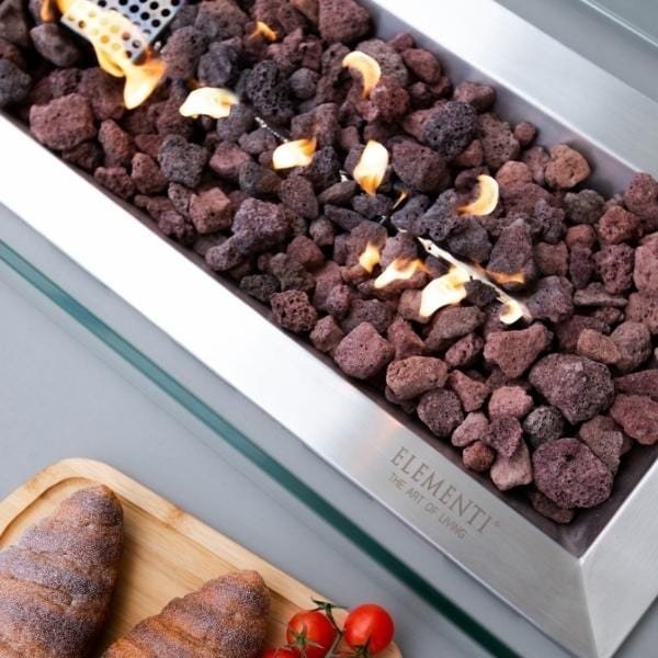 This magnificent rectangular fire table measures 60” by 27” by 17”. Its careful design includes a 30″ long fire pit ring burner that can hold about 13.2 pounds of lava rocks. The entire fixture weighs 175 pounds, which ensures that it’s stable enough to not tip over.