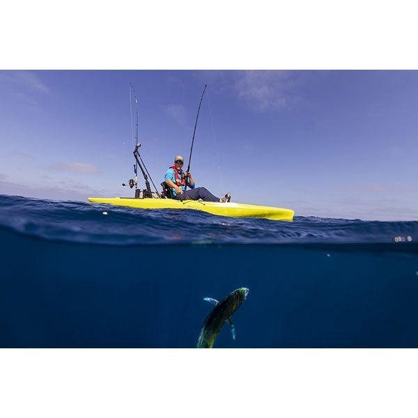 This fully-loaded fishing machine is built for every conceivable fishing expedition, whether you’re prowling the ocean for monster gamefish or stalking bass in your favorite freshwater fishing hole. Hobie has advanced the sport of kayak fishing with Kick-Up Fins that automatically retract upon impact.